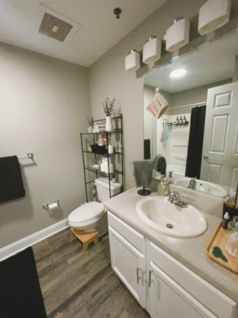 Adding a vase introduces a soft, decorative element that balances out hard surfaces. Artificial greenery like eucalyptus or faux olive branches works beautifully and requires zero maintenance. Both are easy to find on Amazon and add a subtle, spa-like freshness to the space without overwhelming it.