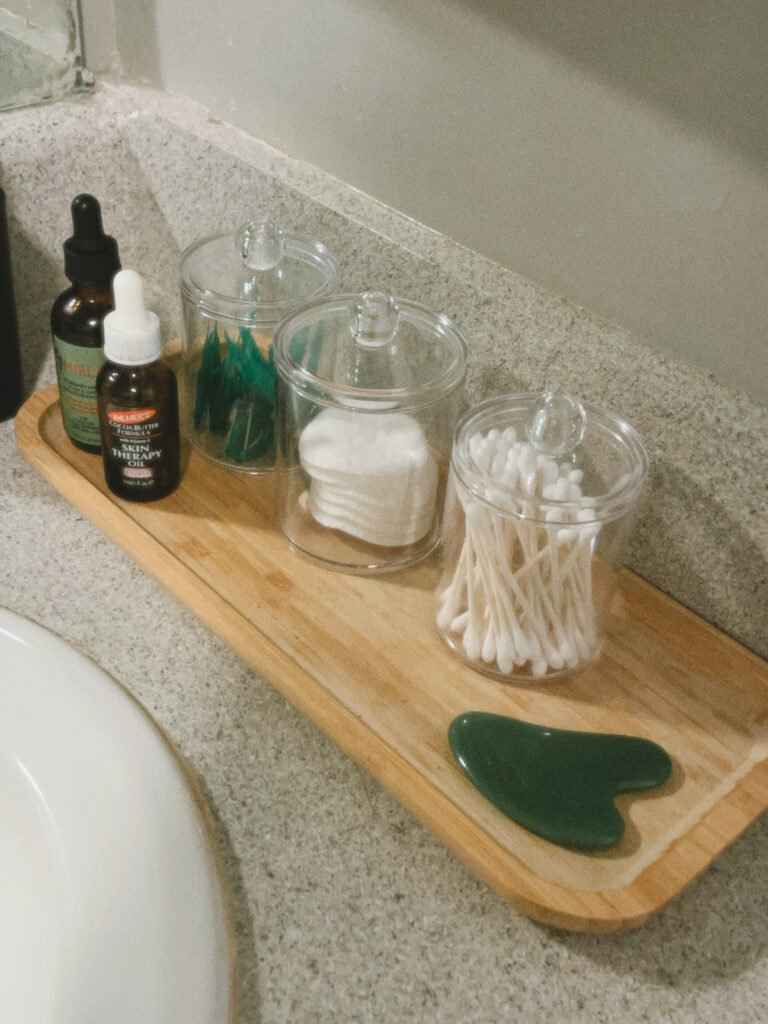 A vanity tray creates order while still feeling elegant. Use it to display daily essentials like cotton pads, q-tips, or moisturizer in a way that looks intentional rather than cluttered. You can also leave your everyday jewelry there for easy access, and add a candle to bring in a relaxing, hotel-worthy atmosphere—especially during evening showers.
